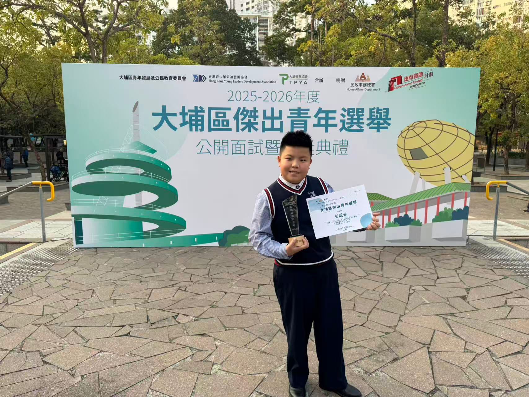 恭賀5D 勞觀泰同學,在眾多參與者中脫穎而出,進入最後五強,經過三次的選拔,獲得「2025-2026年度大埔區傑出青年選舉」大埔區傑出青年(小學組)殊榮