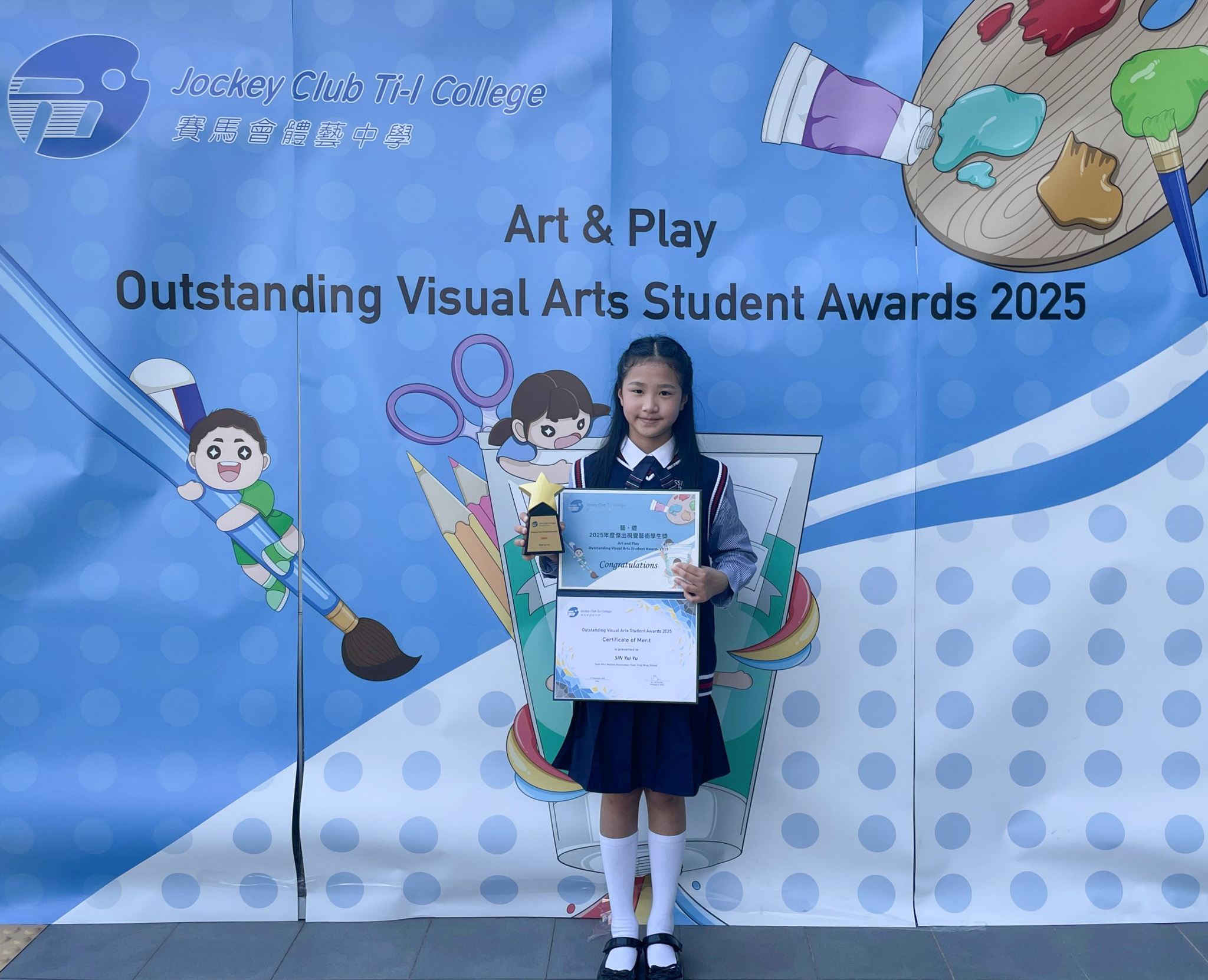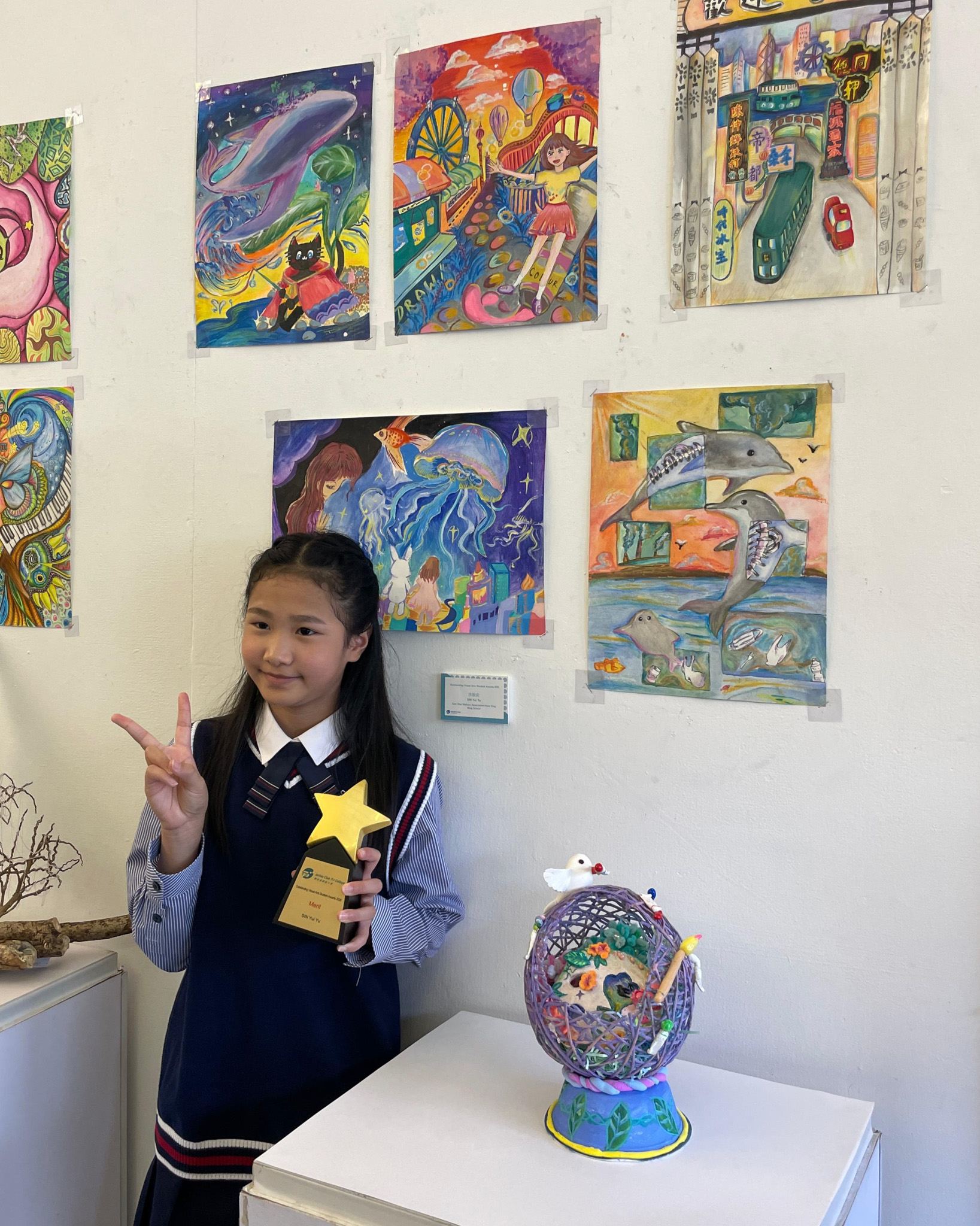 恭喜 5C 冼銳俞同學在賽馬會體藝中學舉辦的「2025年度傑出視覺藝術學生獎」中獲得優異獎, 該獎項每年競爭激烈,全港僅二十名學生入圍,並設三甲及七名優異獎,能夠獲獎實屬難得,其得獎作品現於體藝中學展覽廳展出,充分展現其藝術潛能與創作實力。謹此恭賀銳俞同學,並祝願她在藝術道路上持續探索、再創佳績。