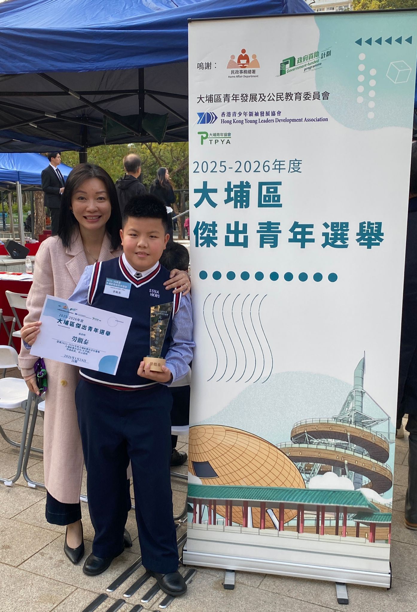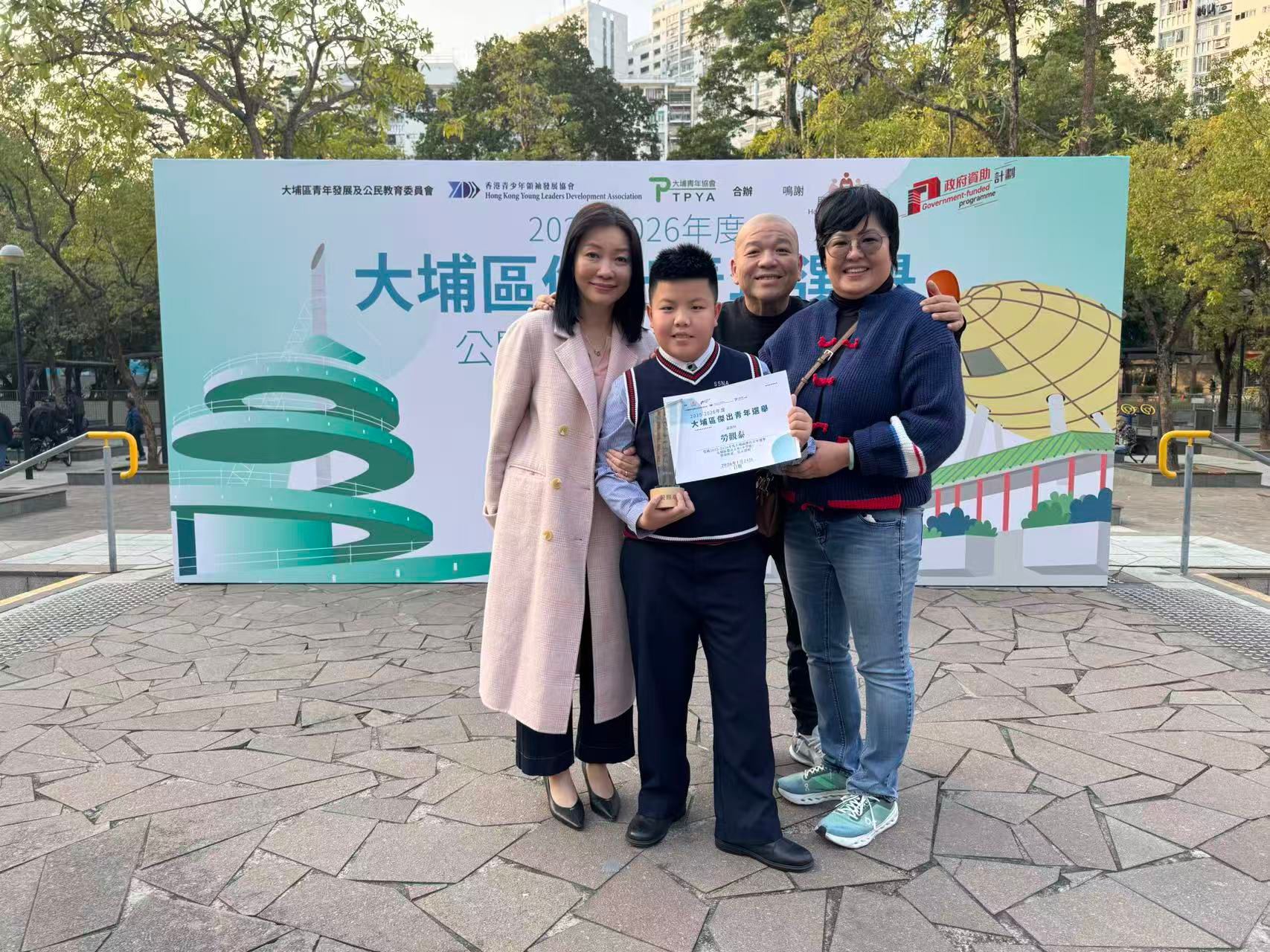 恭賀5D 勞觀泰同學,在眾多參與者中脫穎而出,進入最後五強,經過三次的選拔,獲得「2025-2026年度大埔區傑出青年選舉」大埔區傑出青年(小學組)殊榮